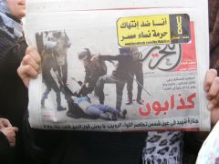 La ligne rouge c’est celle du tabassage de cette femme au soutien-gorge bleu que le monde entier a vu (merci aux reporters de Reuters) se faire massacrer par plusieurs soldats qui lui sautent sur le corps à coups de rangers et la frappent de façon ahurissante tout en lui arrachant ses vêtements. Elle semble avoir survécu et plusieurs femmes m’ont assurée que, cet après midi elle est sur la place, en abaya… donc difficile à reconnaître. Un des slogans les plus repris tout au long de ce cortège qui n’a cessé de grossir (au fur et à mesure, je pense, où les femmes ont été rassurées par la présence du service d’ordre) était : “les images sont plus crédibles que les discours”, faisant allusion à la conférence du Scaf qui, hier soir, a déclaré ne pas avoir abusé de violences envers les protestants. “Ils mentent” dit la Une du journal brandi par de nombreuses manifestantes (ci-dessus, al-fagr, L’Aube).